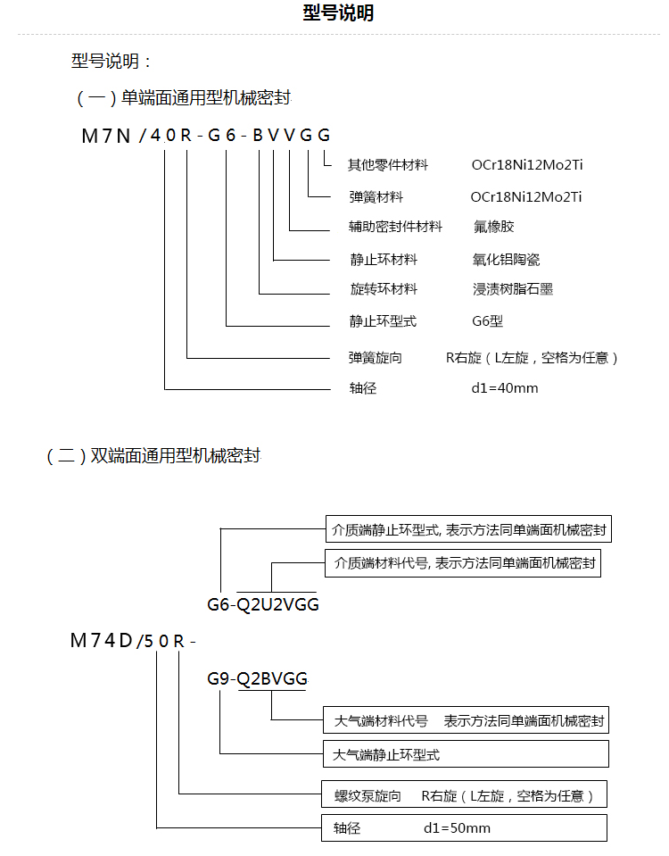 第8栏,密封布置:S-单端面密封结构,D1-背对背式,轴向双端面密封结构,D2-串联式,轴向双端面密封结构。